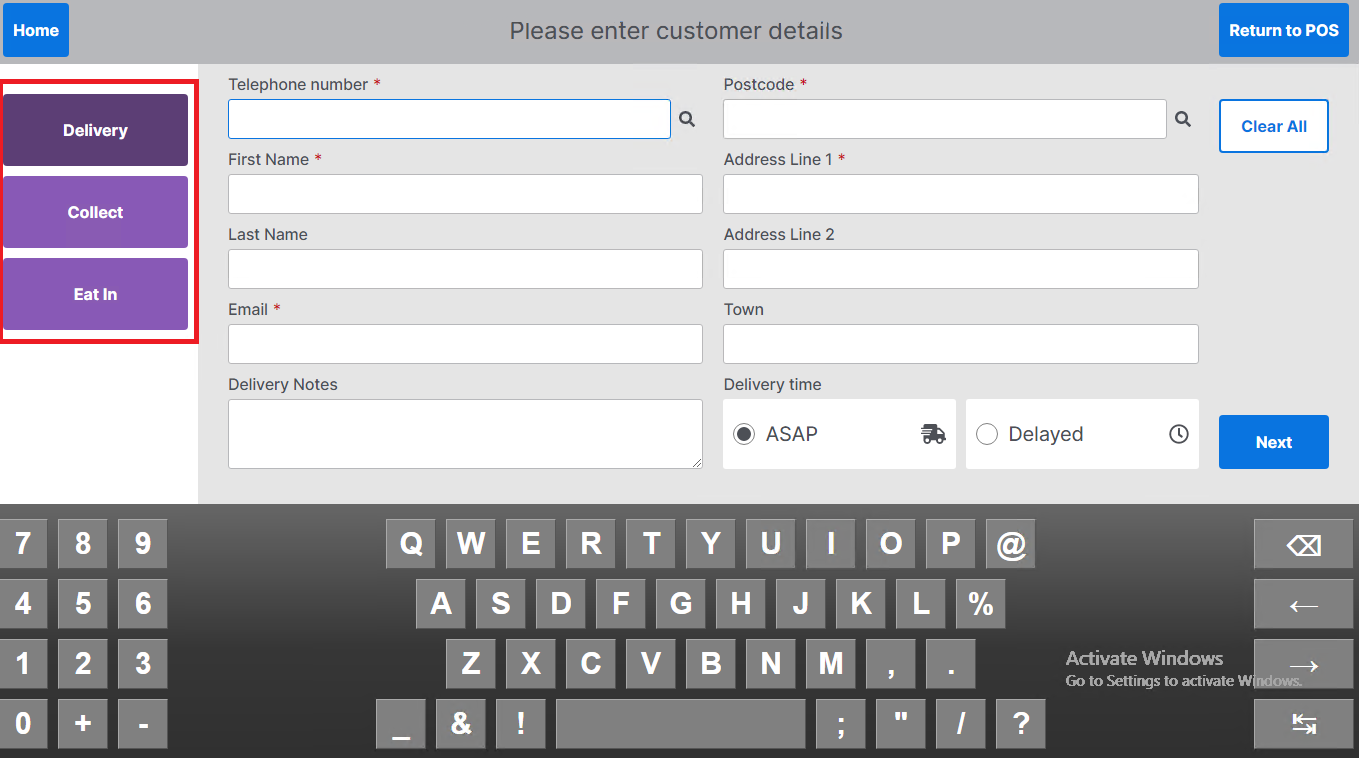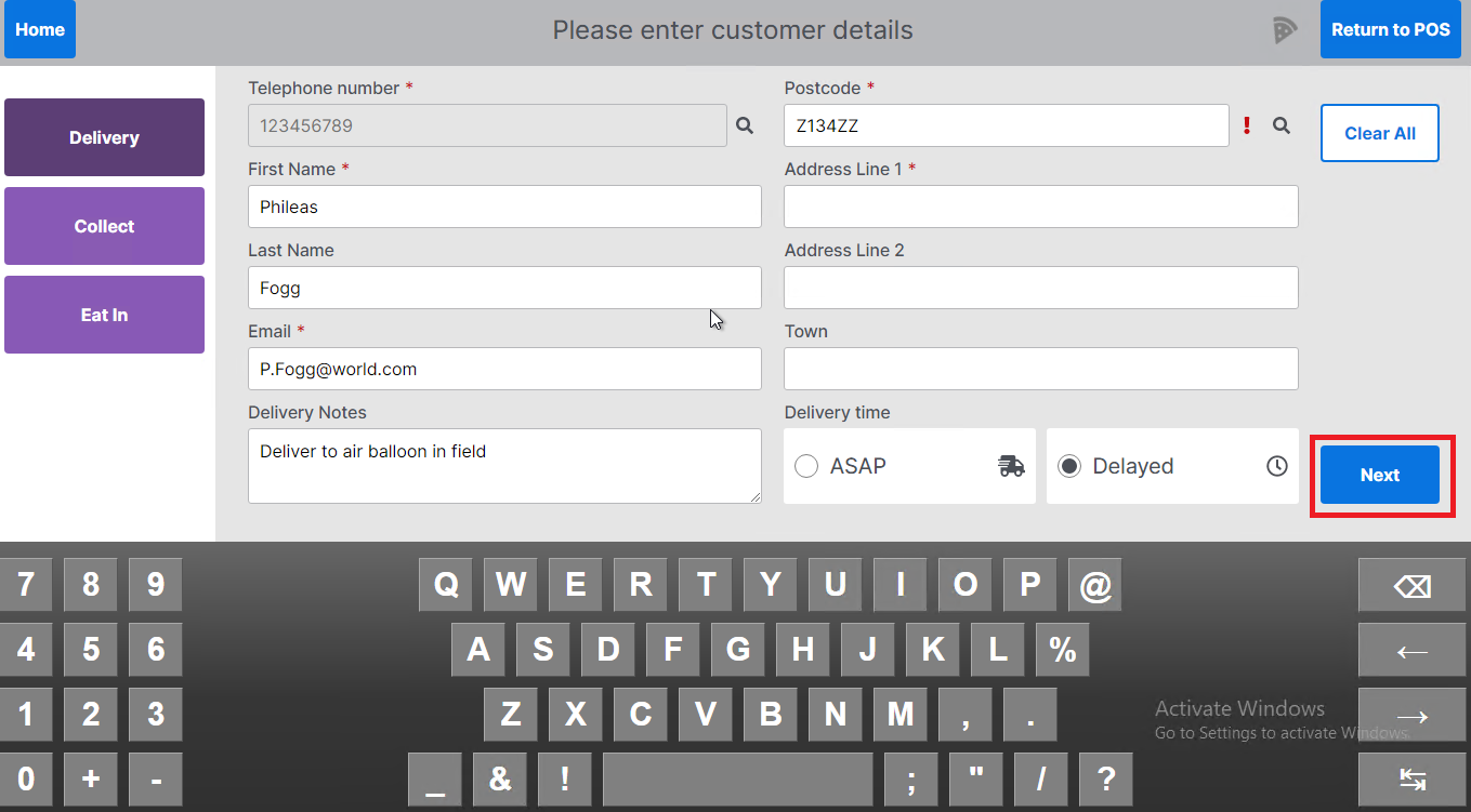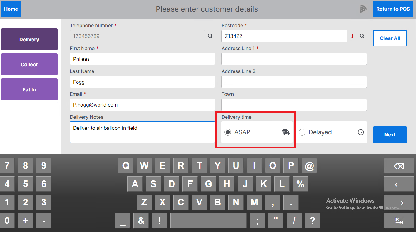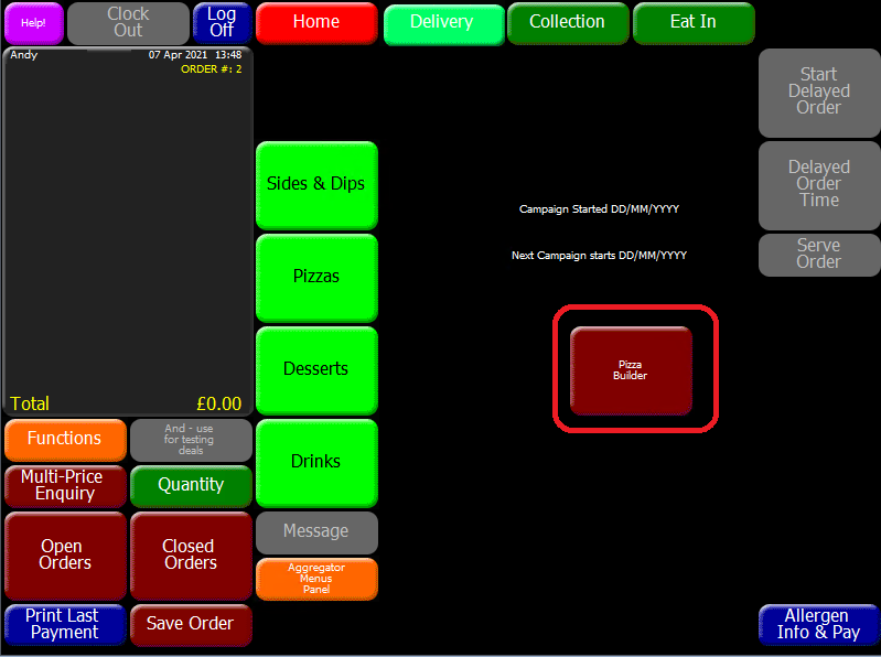 Delayed – Will allow a specific date & time to be selected for fulfilment of the order. If delayed order is selected when the operator progresses to the next screen, they will have the option to select the date & time of order