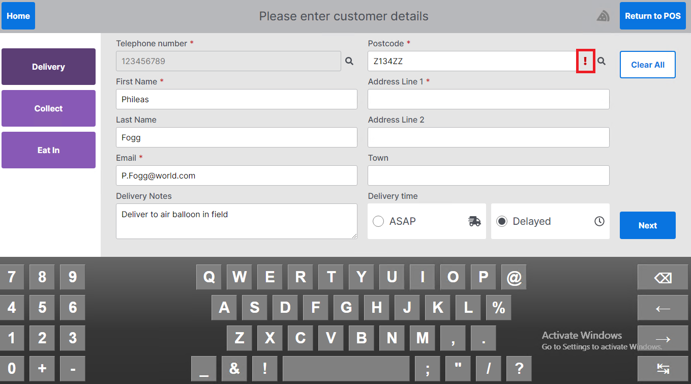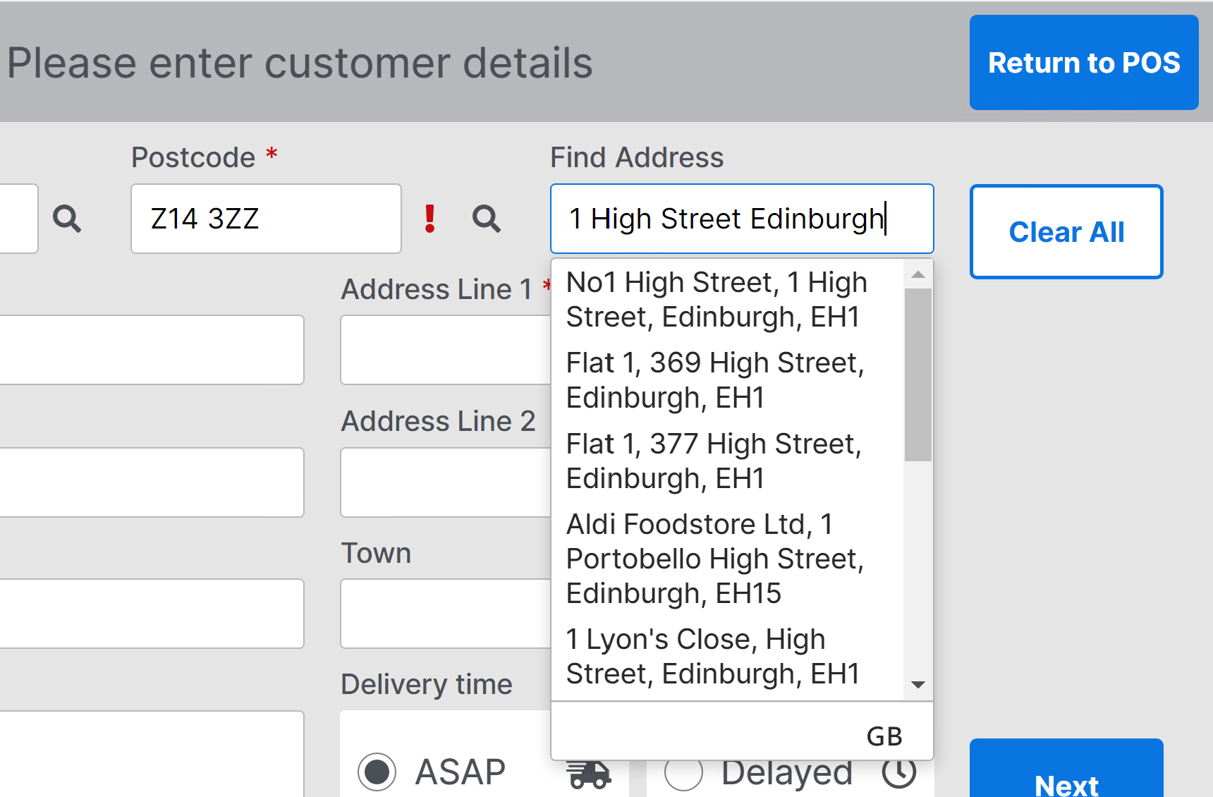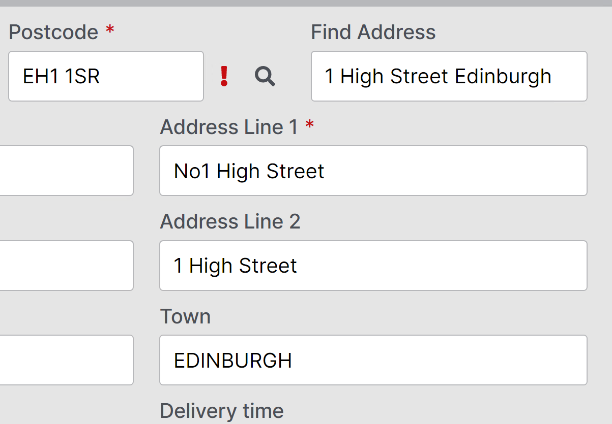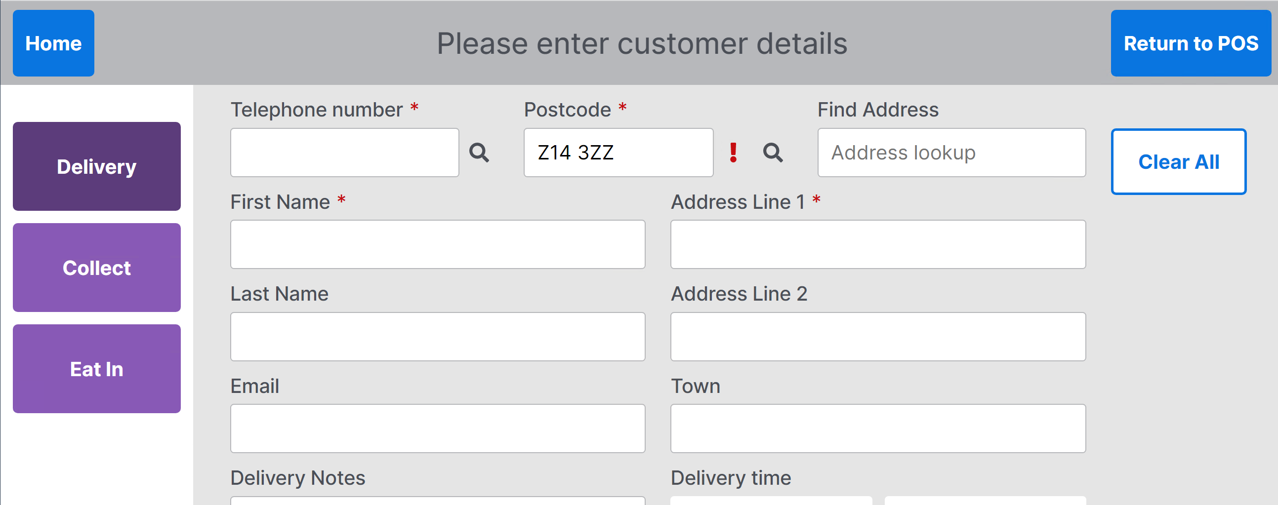 When the customer telephone number or postcode are entered a look up is performed against the customer database.