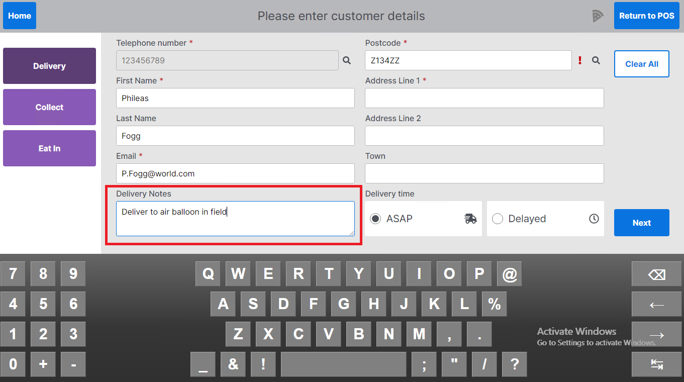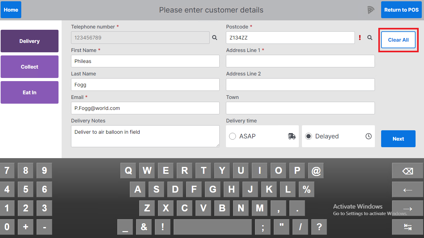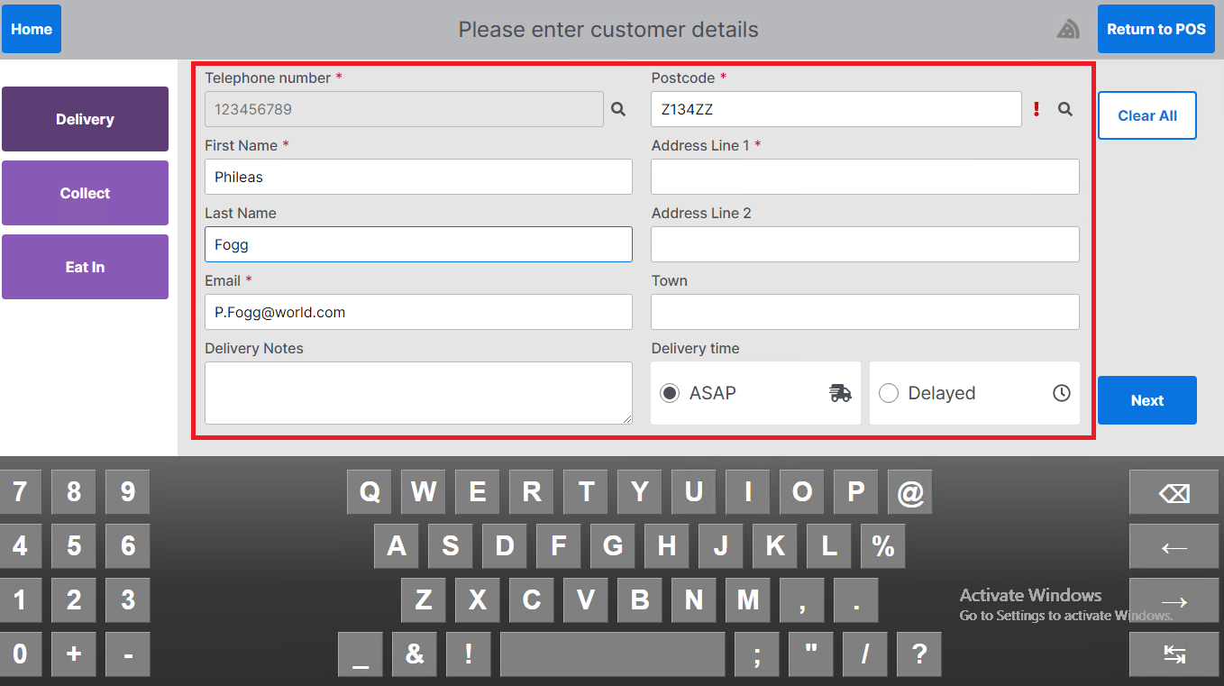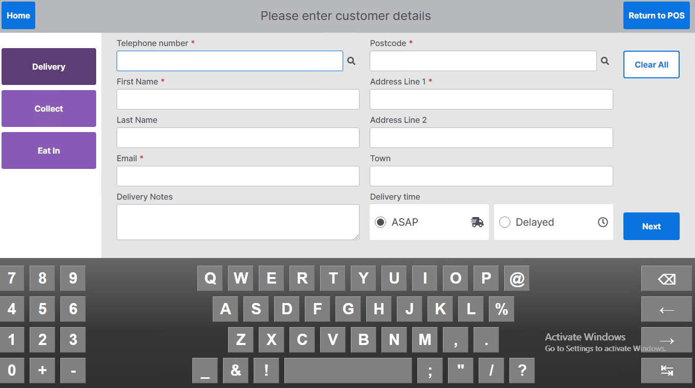 When the customer telephone number or postcode are entered a look up is performed against the customer database.