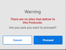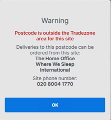 A warning message will be displayed if the postcode is outside the trading zone for that store