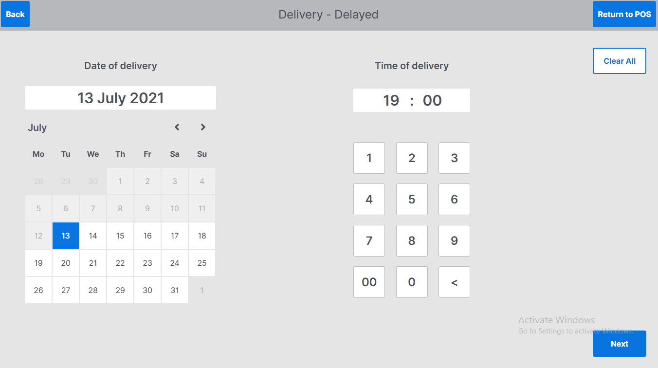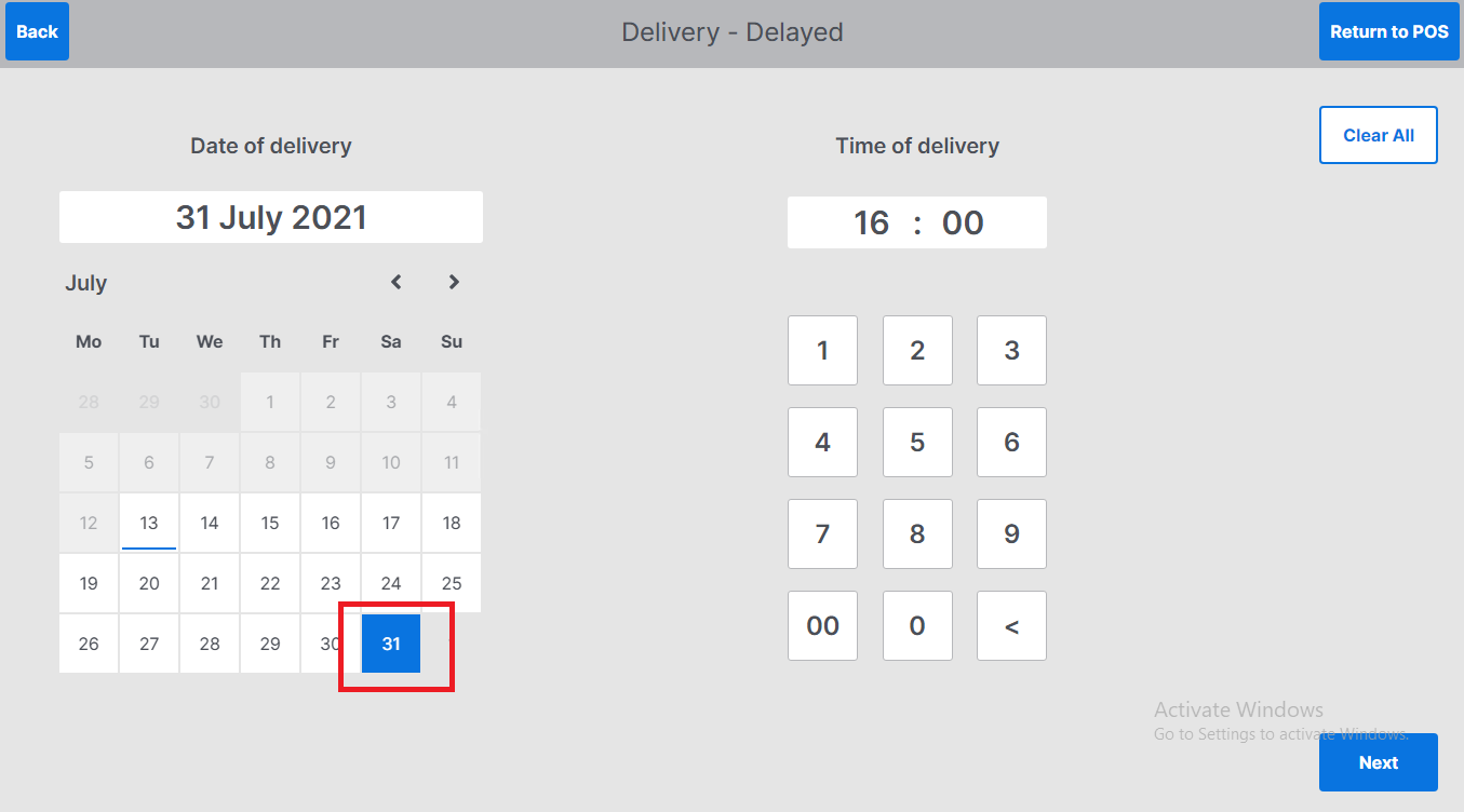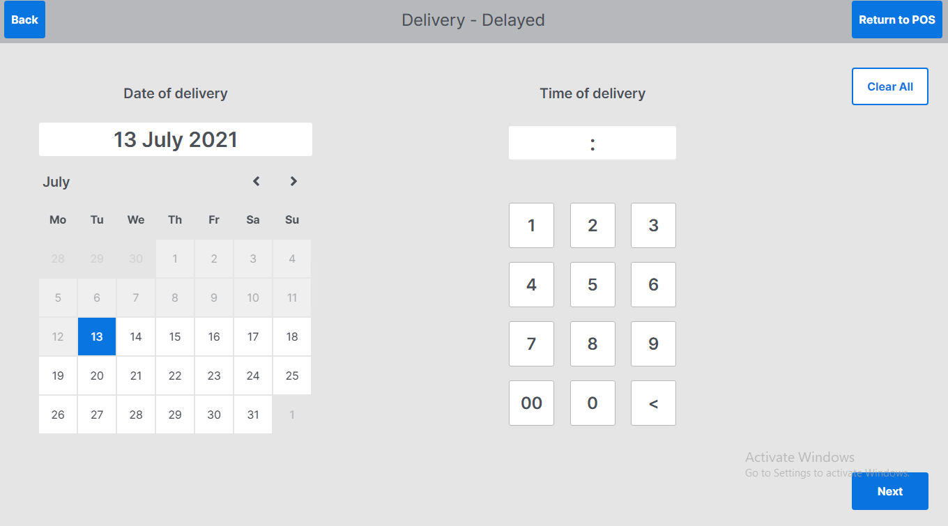 Enter time of delivery using the keyboard – this is in 24-hour clock format