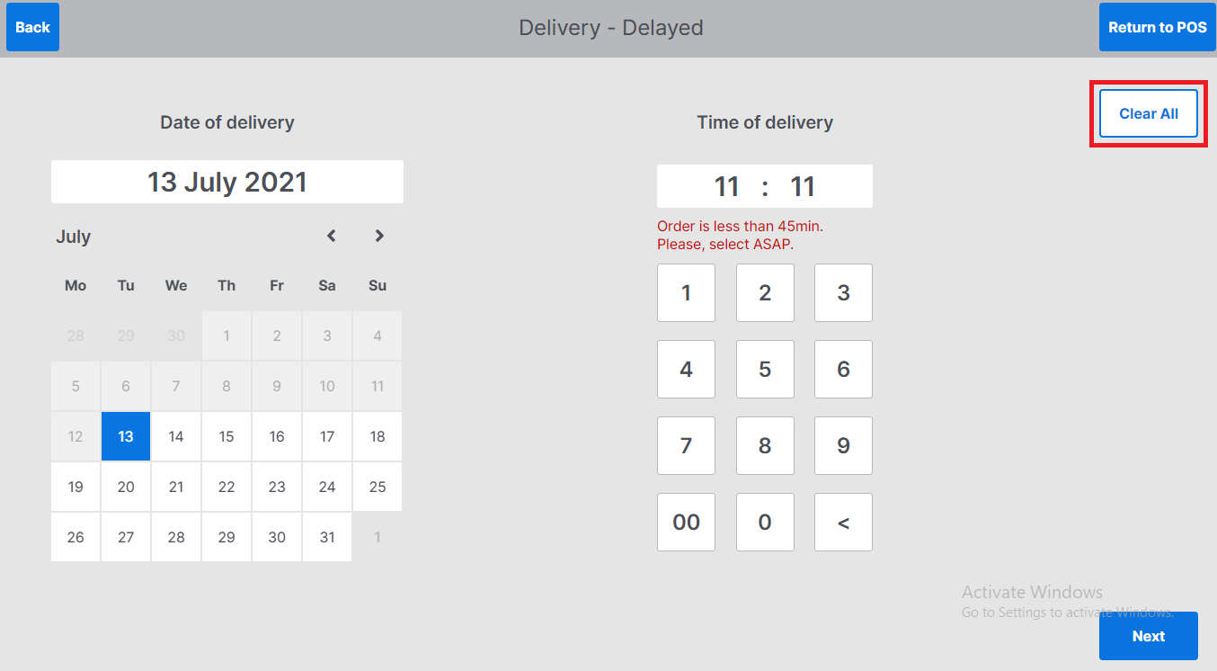 To reset date to today’s date and delete entered time select Clear All