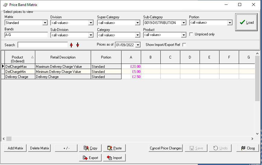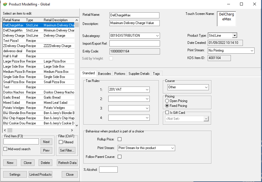 Field Value Retail Name DelChargeMax Description Maximum Delivery Charge Value Subcategory This can be anything but recommended that a new subcategory named "Delivery Charges" is created and that this subcategory is part of a division that is excluded from stocks Product Type Standard Line Portion Standard Portion Unit item Portion Quantity 1 Supplier Any Stock Unit item Supplier unit item Supplier Cost £0.00 Default Supplier true -