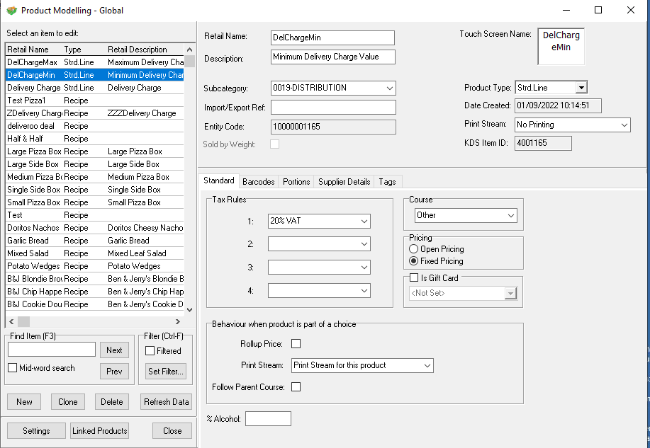 Field Value Retail Name DelChargeMin Description Minimum Delivery Charge Value Subcategory This can be anything but recommended that a new subcategory named "Delivery Charges" is created and that this subcategory is part of a division that is excluded from stocks Product Type Standard Line Portion Standard Portion Unit item Portion Quantity 1 Supplier Any Stock Unit item Supplier Unit item Supplier Cost £0.00 Default Supplier true