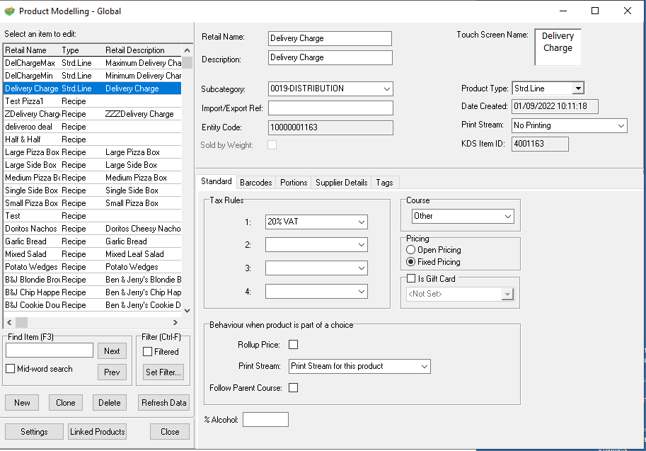 Field Settings Retail Name Delivery Charge Description Delivery Charge Subcategory This can be anything but recommended that a new subcategory named "Delivery Charges" is created and that this subcategory is part of a division that is excluded from stocks Product Type Standard Line Portion Standard Portion Unit item Portion Quantity 1 Supplier Any Stock Unit item Supplier unit item Supplier Cost £0.00 Default Supplier true -