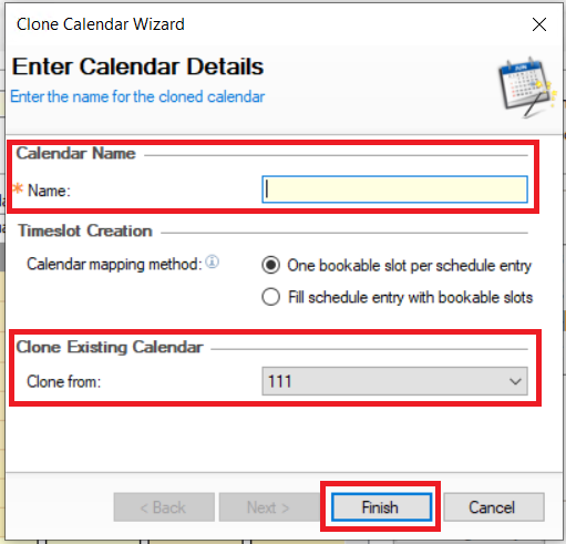 Select a calendar from drop down list under Clone from and click Finish