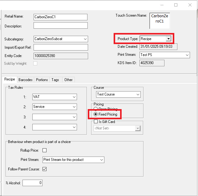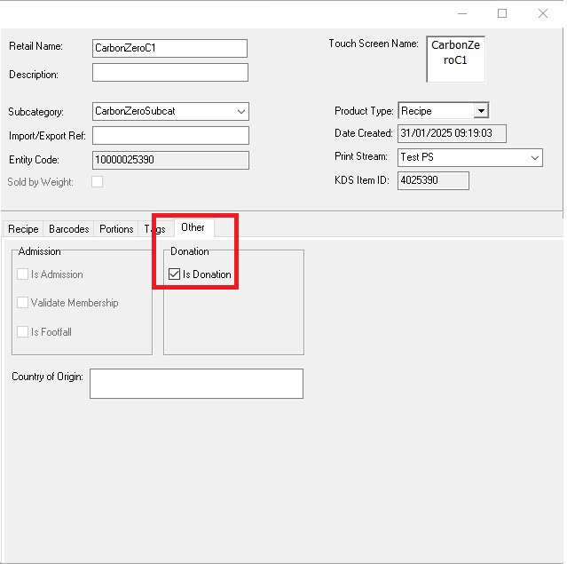 Also, within Product Modelling | Other tab, 'IsDonation' checkbox is ticked and it contains no child recipes or choices.