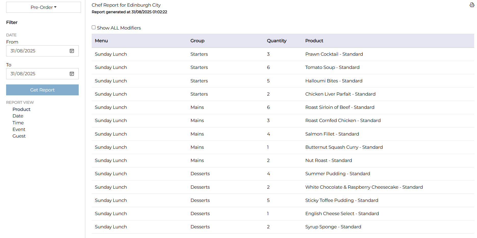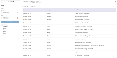 Once all errors have been resolved, you may want to provide the kitchen team with a copy of the chef report so they can prepare large orders in advance. We recommend using the report from the Events Host app, specifically the version that lists the number of items per event. The chef report can then be printed directly from the host application.