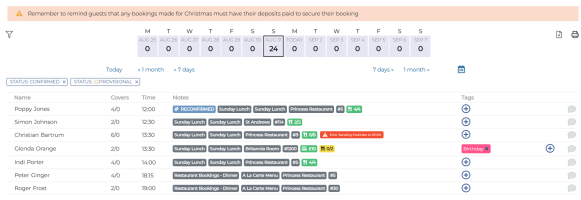 The Day Diary in the Events Host app displays all expected bookings for the current day. If any pre-orders fail to send, an error badge will appear in the notes column.