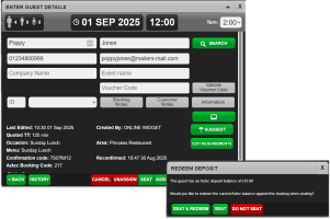 If the booking includes a deposit, a Redeem Deposit prompt will appear. Select Seat & Redeem to apply the deposit to the table in point of sale.