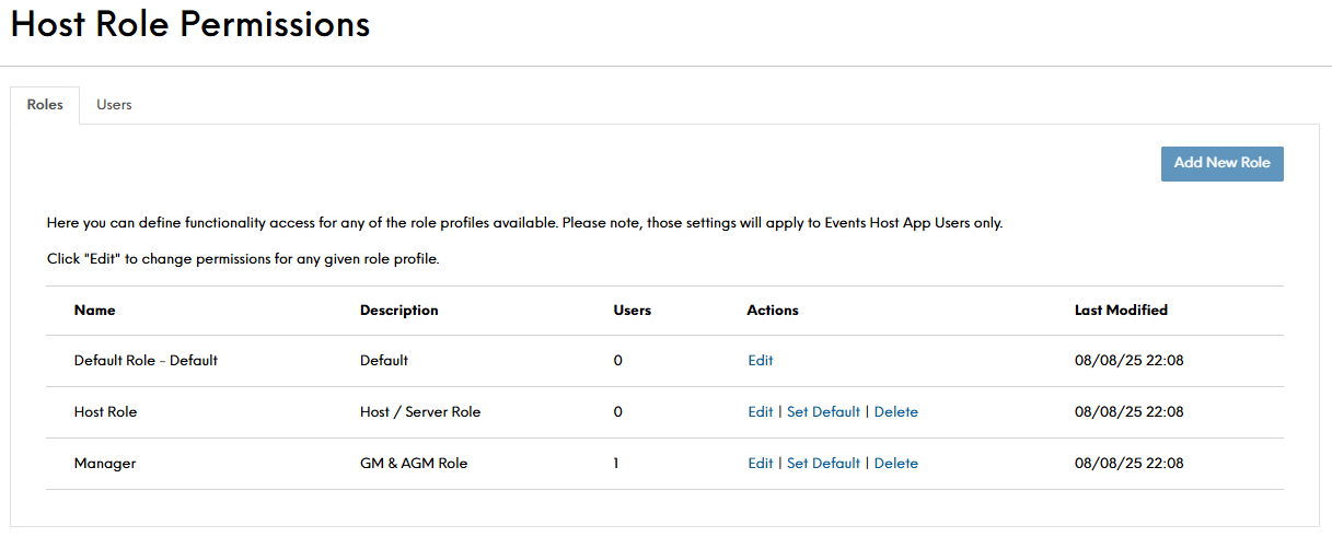 Delete - once clicked it removes the appropriate role, while moving all assigned Host users to the default role