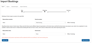 Events menus and Reservations menus are incompatible. The mappings section will allow you to specify which Events menu to use for each of the Reservations menus that are in use for the imported bookings. Please note that Events booking rules may cause bookings to have different deposit requirements, due dates and may also require the guests to make selection from a pre-order menu.