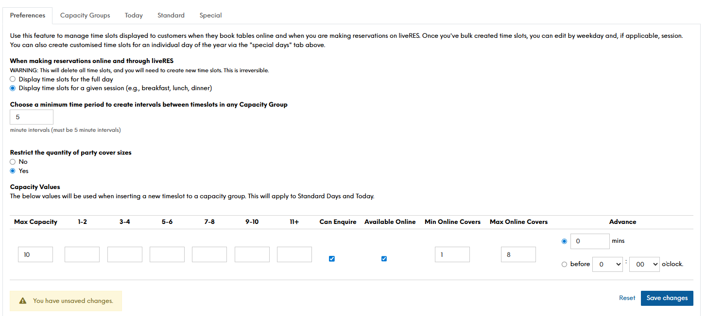 Within the below image, the max capacity is set to 10 covers, the can enquire is set to yes, along with the available online etc. When creating a new line of capacity within standard days, today or even additional capacity group, these values will pre-populate