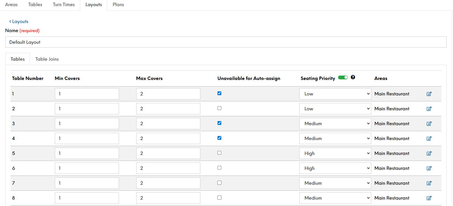 The Layouts tab allows you to define the minimum and maximum number of covers allowed for each table, and reserve tables for walk-in customers. You will also be able to define table areas, as well as their priority.