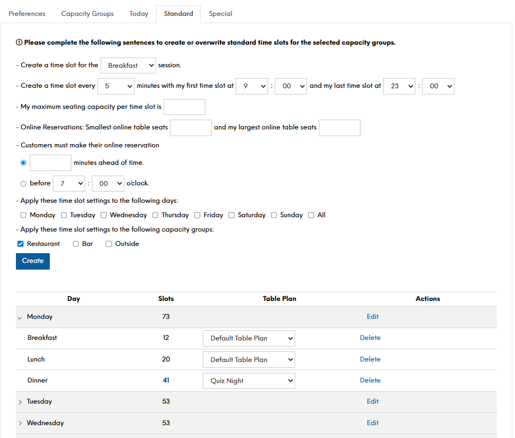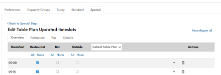 The Plans tab allows you to create a Tables plan that groups together specific turn times and table layouts. This allows you to save different combinations of table layouts / turn times for specific events, such as only offering tables for 2 on Valentine’s day, or even having varying table joins on a weekend versus a weekday.