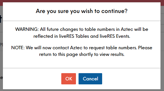 The Aztec Table Numbers section allows you to configure Tables to read the table numbers directly from Aztec. By enabling this setting, Tables is always up-to-date with all changes to table numbers that are made in Aztec. Tables can also be added manually, without a link to Aztec.