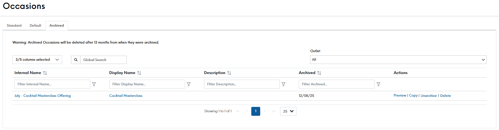 To manage Archived Occasions / Menus, you will need to go to the tab named Archived. This can be found on both the Occasion & Menus configuration sections as show below: