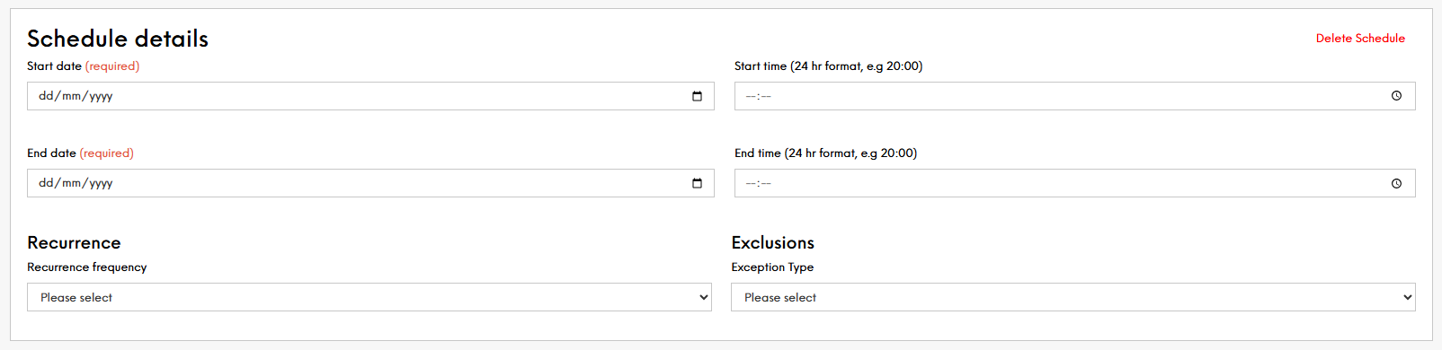 Specific dates where the schedule should not apply. For example, if your event recurs every Saturday but you want to skip a specific holiday weekend, you’d list that date here. When defining exclusions, you will need to select a frequency of either: