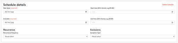 The details of the schedule will be wiped. If you have clicked Delete Schedule by accident, simply click onto the topic header in the menu column and it will not save the change made -