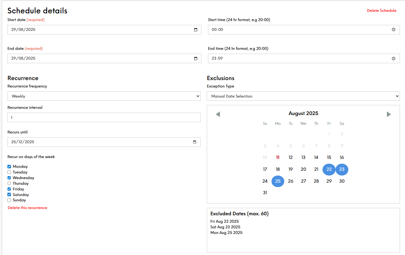 Defining a recurrence interval. Usually set to "1" Stating an end date that this recurs until: DD/MM/YYYY Along with the days of the week Alternatively within the Occasions, Menus & Areas (but NOT Extras) you are able to select an exclusion type. Aside from the above, you have the option to configure by Manual Date Selection. You can select up to 60 days to exclude from your schedule |