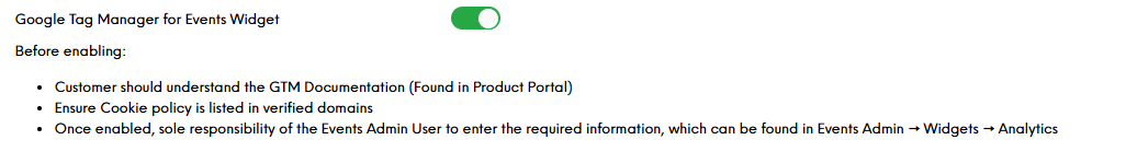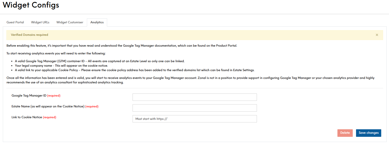 A valid Google Tag Manager (GTM) container ID – All events are captured at an Estate Level so only one can be linked.Estate admin, input Estate name, container ID and link to customer cookie notice (ensure link to cookie notice is in verified domains).