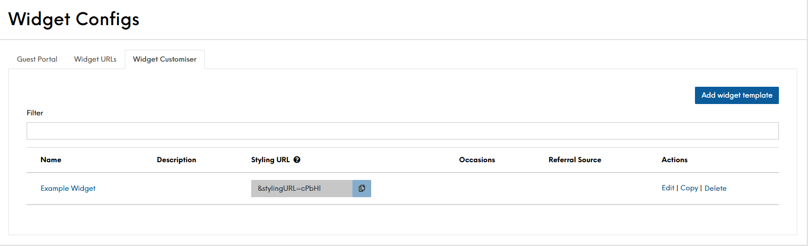 To apply your customised widget template, copy the unique stylingURL (as shown below) and paste it at the end of your full widget URL. You can find out how to get your full widget URL under the Widget URLs topic
