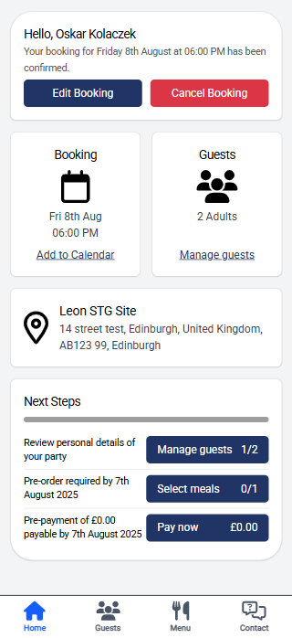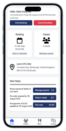 Guests can now add their booking directly to their preferred calendar, including Apple Calendar, Google Calendar, Office 365, Outlook, or Yahoo. The ‘Next Steps’ section offers guidance and quick access to any outstanding actions, while a new task bar at the bottom of the screen enables easy navigation between sections.