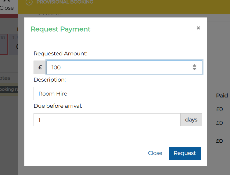 The Events Host can now request payments directly on a booking. These payments are separate from standard booking requirements and can be used to account for specific items such as room hire.