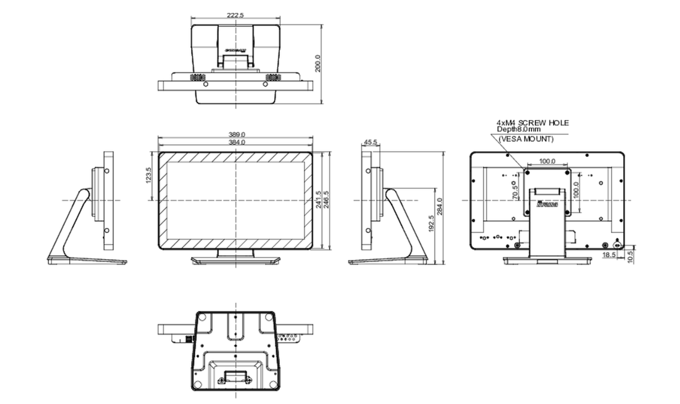 389 mm x 247 mm x 200 mm (with stand) 389 mm x 247 mm x 46 mm (without stand) |