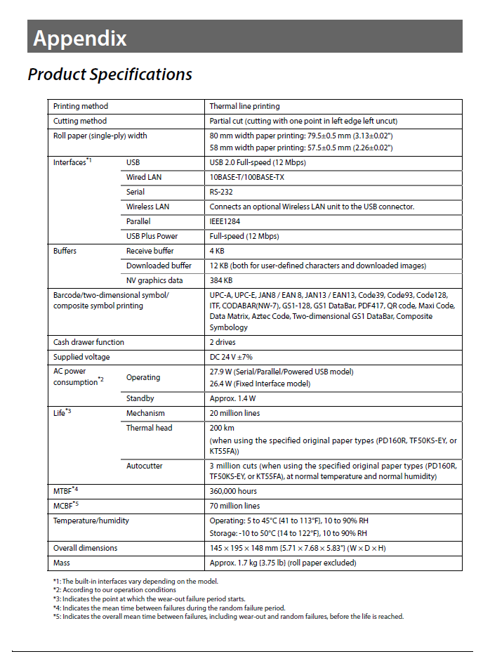 80 mm width paper printing: 79.5 ± 0.5 mm (3.13 ± 0.02") 58 mm width paper printing: 57.5 ± 0.5 mm (2.26 ± 0.02") |