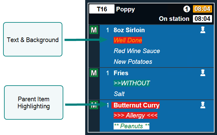 Text rules allow specific word matches to be displayed with alternative text and background colours, making key instructions or preparation details stand out. This is especially useful for highlighting allergens and ensuring critical information is easily noticed.