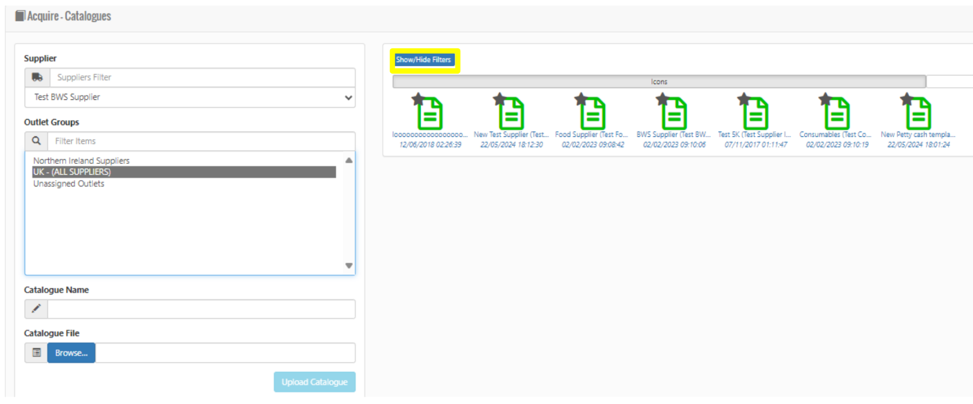 To filter the list of Catalogues, select Show/Hide Filters and define the toggle settings to display or hide the different suppliers.