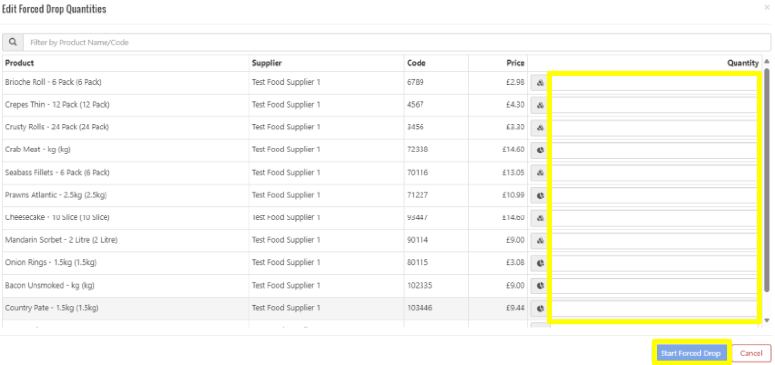 4. Input the Quantity required for each product then select Start Forced Drop