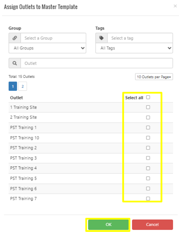 Now select the outlet or outlets from your estate you wish to assign to this template, and click OK.