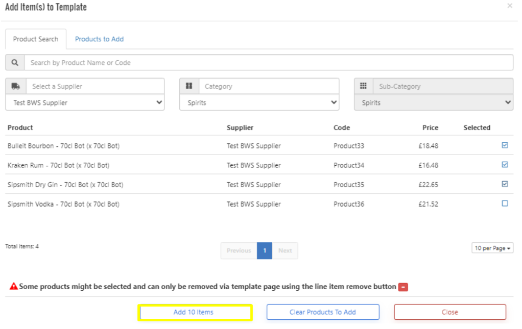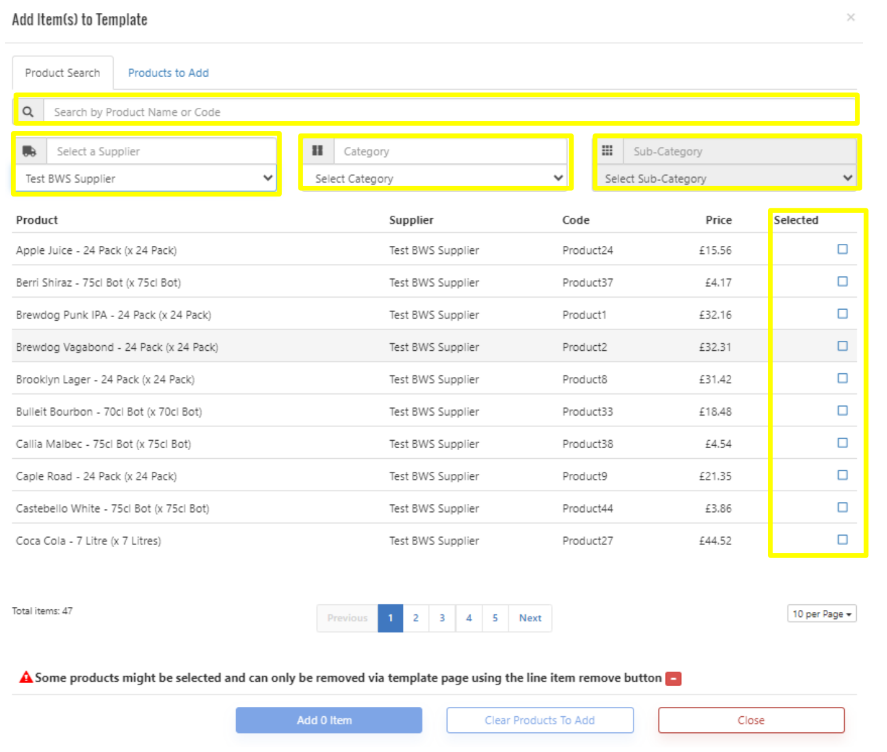 - Search by either Product Name or Code, or alternatively select the relevant Supplier and filter by Category and Sub-Category, putting ticks in the boxes of required products.