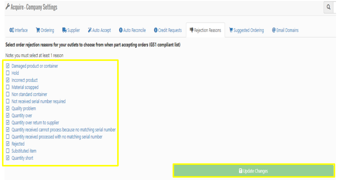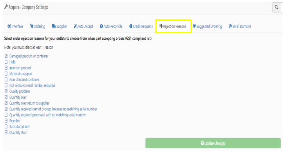 When partially accepting an order, a reason needs to be selected. This document guides you through selecting all reasons relevant for your venues.