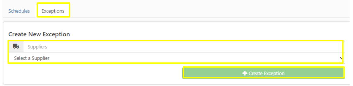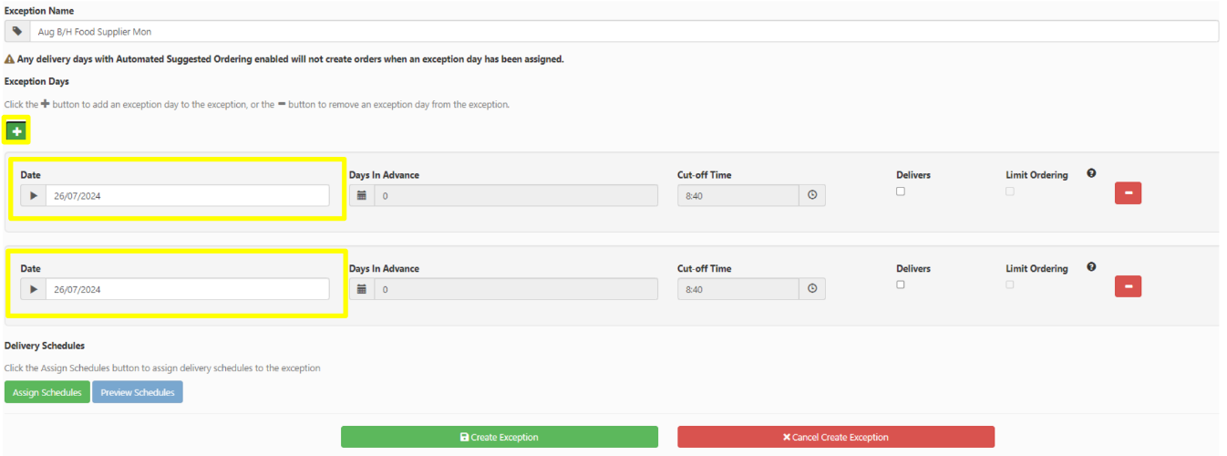14. Select the green Assign Schedules button, which will open your Assign Delivery Schedules to an Exceptionpage.