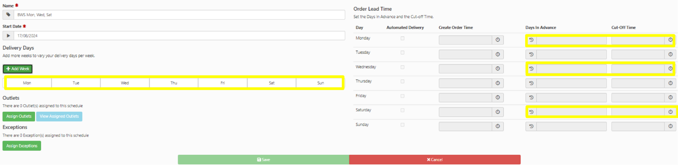 Select the Delivery Days on the left, then input the Days in Advance and Cut off Time on the right.
