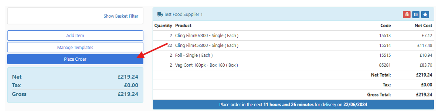 Add items to the basket in the as you would usually, and select Place Order.