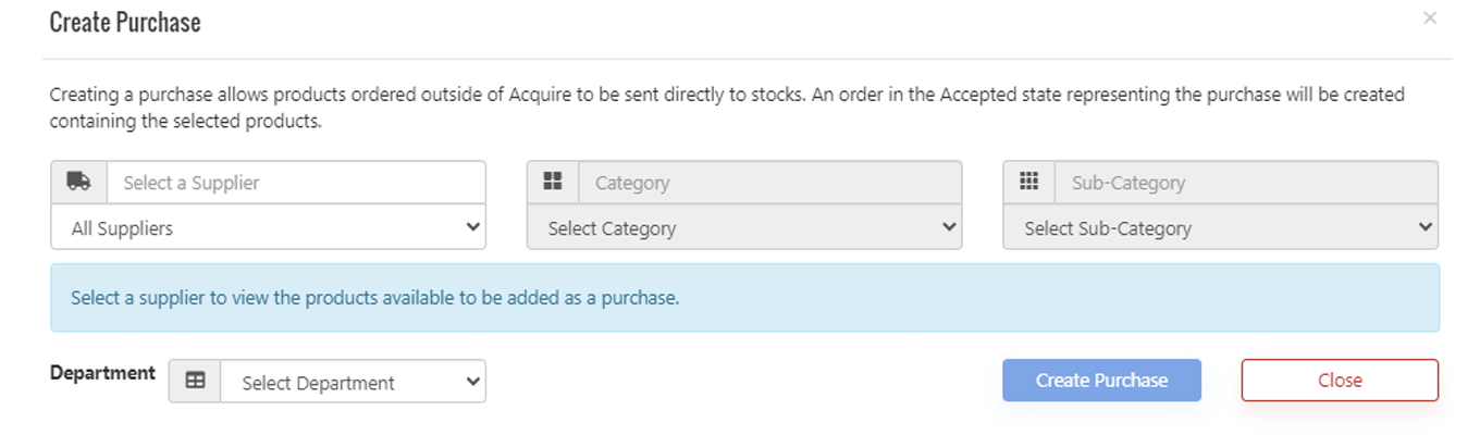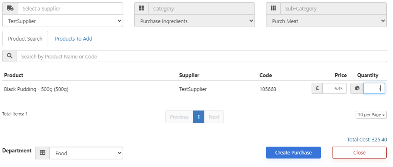 Select Create Purchase, select a department, select the supplier, and add in all appropriate products.