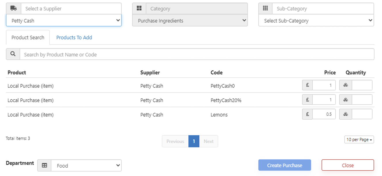 You can then select a supplier, and the products available. This can be specific products, or a generic Petty Cash line, as shown in the below image.