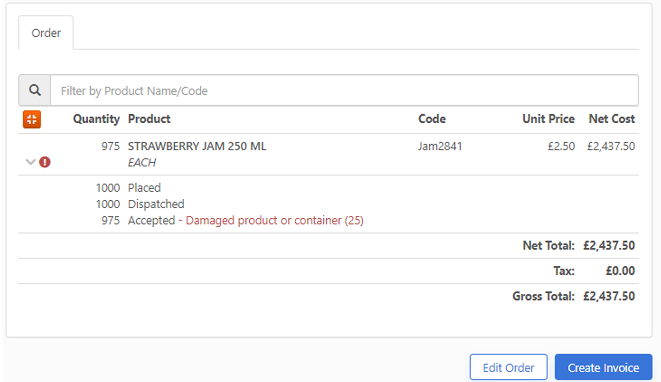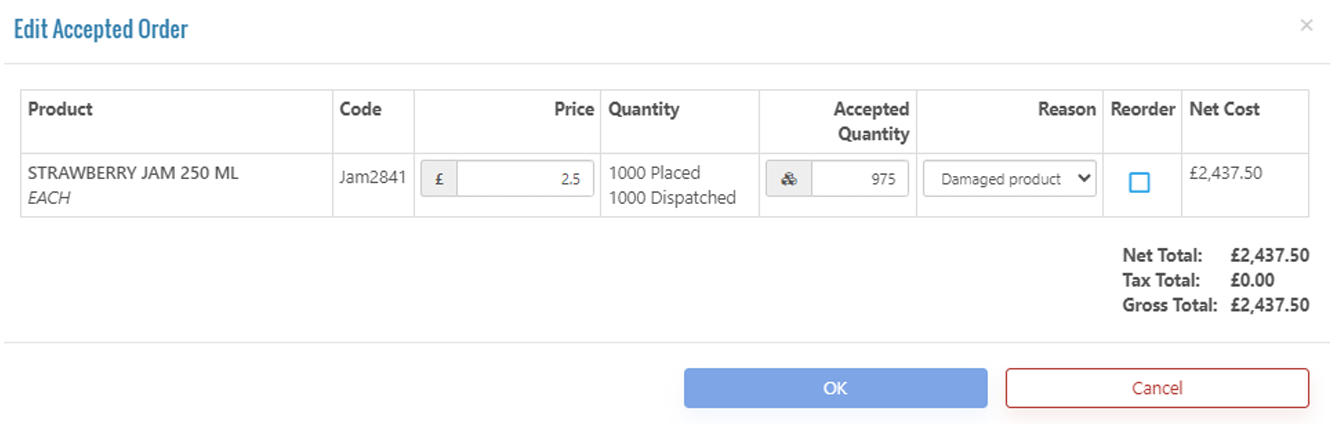 - Edit the price and/or accepted quantity as appropriate, ensuring a reason is selected.