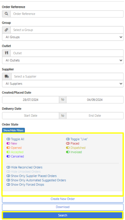Use the filters on the left-hand side to locate the orders you are looking for by utilising the Order State icons.