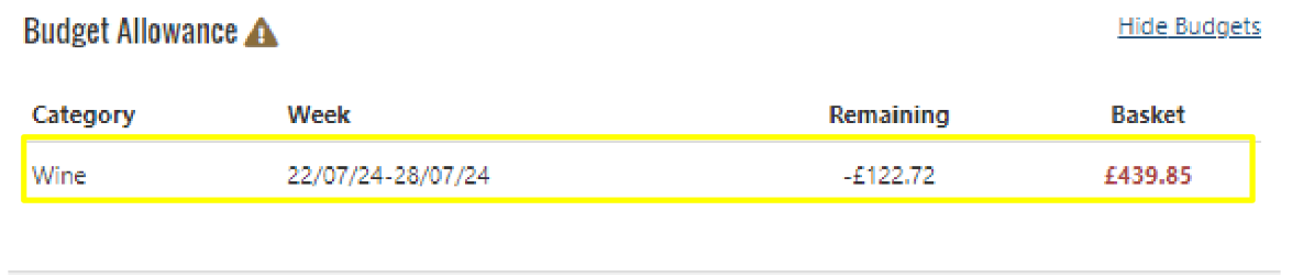 - You will now see the below, showing that the created order (if placed) will take us over our Budget allocated for this Category.