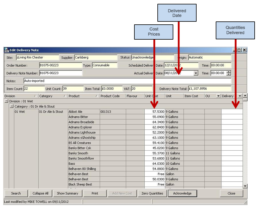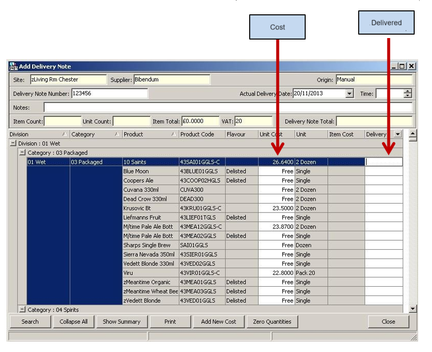 6. Enter the delivered amounts in the right-hand column (costs can be amended to match the cost on the delivery note)