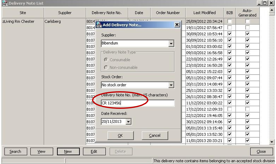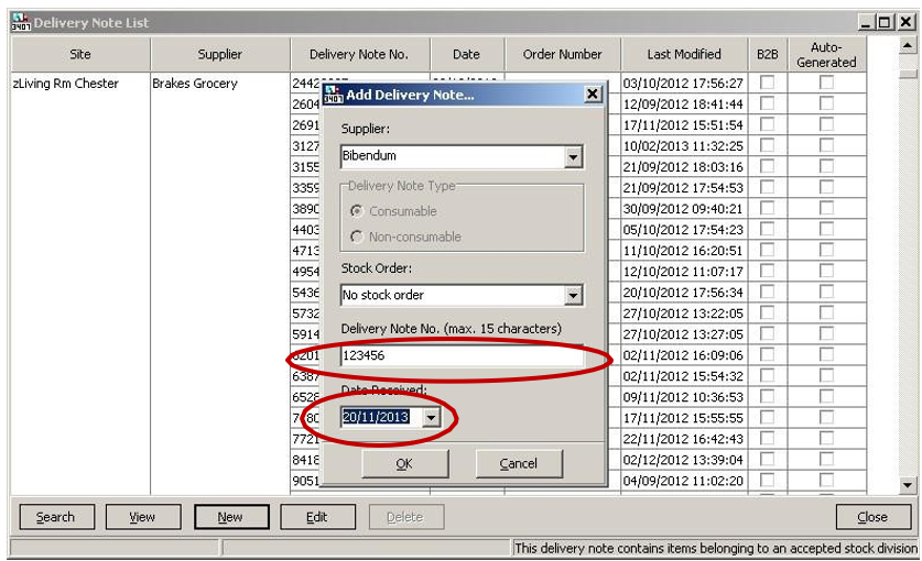 5. Enter the delivery note number and date the delivery was received, then select OK