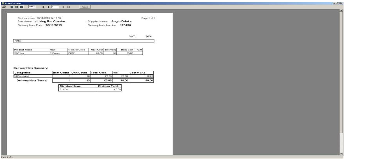 8. The delivery note will print out. It is advised to staple this copy to the actual delivery note received from the supplier.
