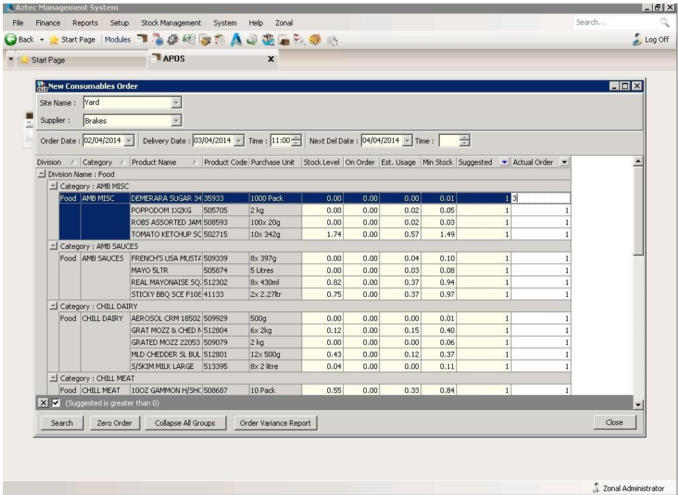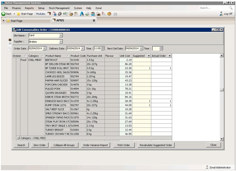 Double Click on the order and a Suggested Order will be calculated instantly and appear – suggested levels are listed in the Suggested column, and the Actual Order columns on the right-hand side. The Actual Order column is editable.