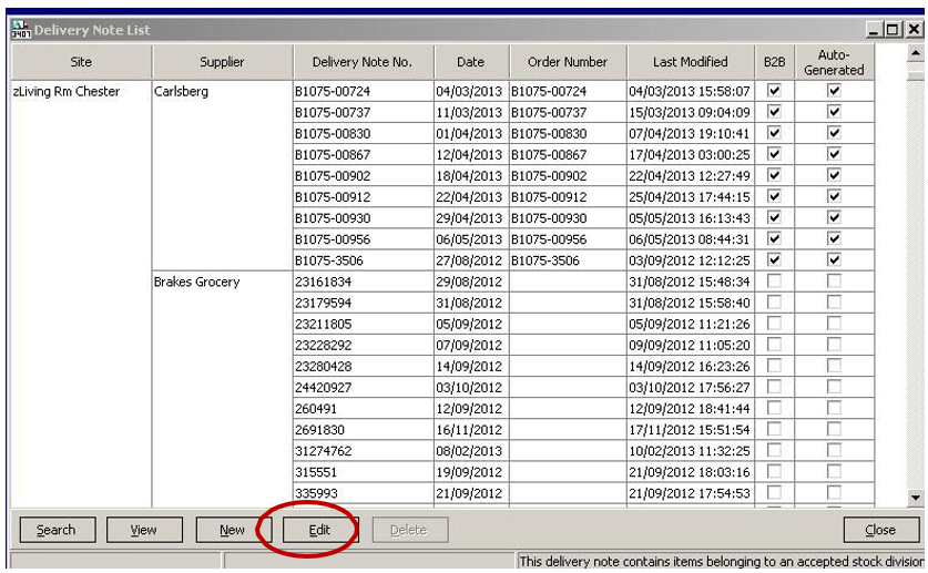 3. Highlight the delivery note that requires amendment and select Edit