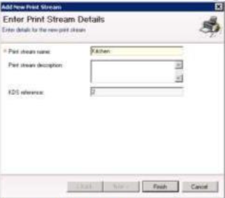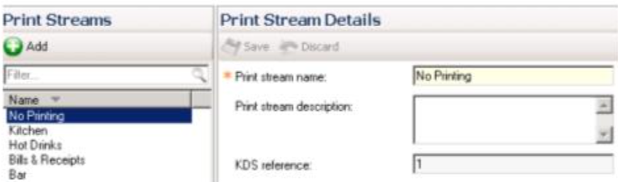Print streams are used to define areas in which different printing can happen, e.g., bars and kitchens. Once configured, the physical printers are linked to print streams, so that they print the right tickets, receipts bills, vouchers, etc.